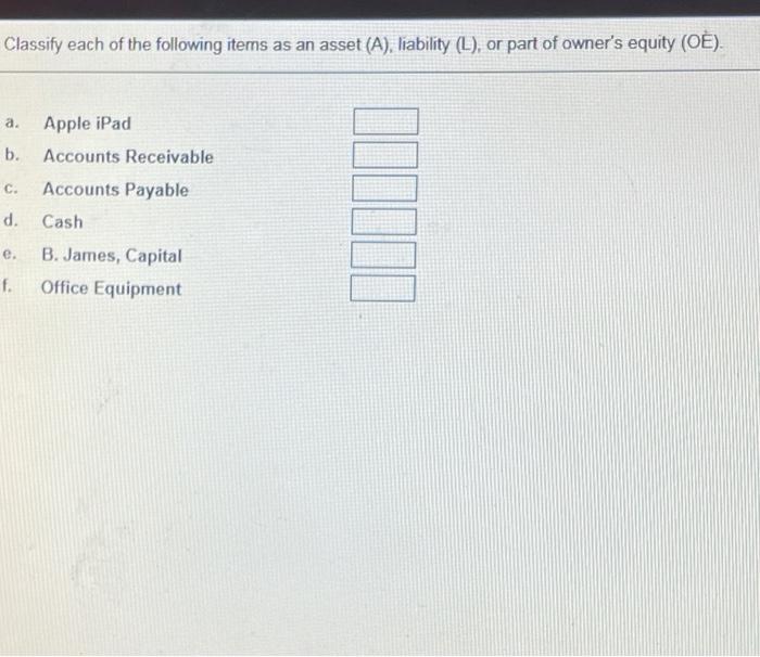 Indicate whether each of the following items is an asset liability or part of owners equity. Classify each of the following items as an Asset Liability Owners Equity - Group sort. Business Accounting QA Library Classify each of these items as an asset liability or stockholders equity and determine the total dollar amount for each classification.